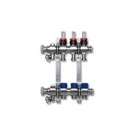Rozdzielacz ze stali nierdzewnej z pomiarem i regulacją przepływu na zasilaniu. Wkładka termostatyczna na powrocie, uchwyt ścienny i zawór spustowy. 3