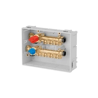 Zespół regulacyjny – regulacja stałotemperaturowa. Wstępnie zmontowany w skrzynce inspekcyjnej. 12 wyjść. Dodatkowy rozdzielacz obiegu pierwotnego z dwoma wyjściami.