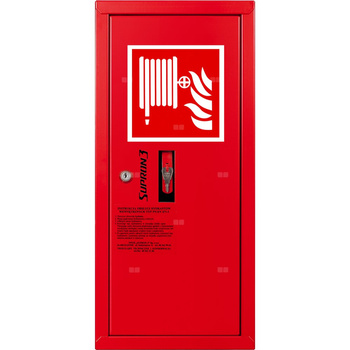 Hydrant DN 52 zawieszany boczny z koszem, z miejscem na gaśnice, wąż 20 m, zamek patent, RAL 3000 lewy